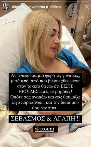 Νωρίτερα, ο Δημήτρης Αλεξάνδρου δημοσίευσε και αυτός μία φωτογραφία από το μαιευτήριο. Στη λεζάντα της εικόνας που δείχνει την Ιωάννα Τούνη να κρατάει το νεογέννητο, ο παρουσιαστής έγραψε το εξής μήνυμα: «Αν αγαπούσα μια φορά τις γυναίκες, μετά από αυτό που βίωσα χθες μέσα στον τοκετό θα πω ότι ΕΙΣΤΕ ΗΡΩΙΔΕΣ εσείς οι μαμάδες! Οπότε σας αγαπώ και σας θαυμάζω λίγο παραπάνω… και τη δικιά μου όσο δεν πάει! Σεβασμός και αγάπη».