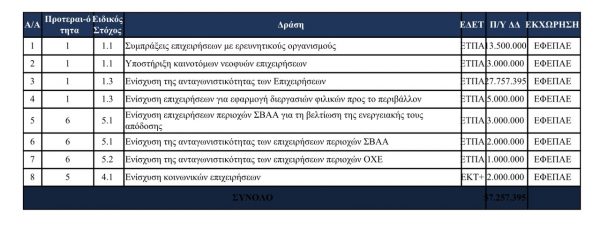 Πρόκειται για δράσεις που αφορούν κρατικές ενισχύσεις των επιχειρήσεων ύψους περίπου 58 εκ. ευρώ οι οποίες εστιάζουν σε μία ευρεία γκάμα σύγχρονων δράσεων με επίκεντρο την έρευνα, την ανταγωνιστικότητα, την ανάδειξη νεοφυών επιχειρήσεων και την περιβαλλοντική και ενεργειακή αναβάθμιση με κοινό στόχο την στήριξη της επιχειρηματικότητας στο νησί.