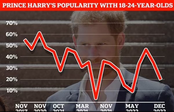 Σαν να μην έφταναν αυτά, ο πρίγκιπας Χάρι χάνει και τη δημοτικότητά του στους νέους 18-24 ετών. Η Generaztion Z στο Ηνωμένο Βασίλειο στρέφεται εναντίον του. Έχουν κουραστεί από τις συνεχείς επιθέσεις του εναντίον της βασιλικής οικογένειας.