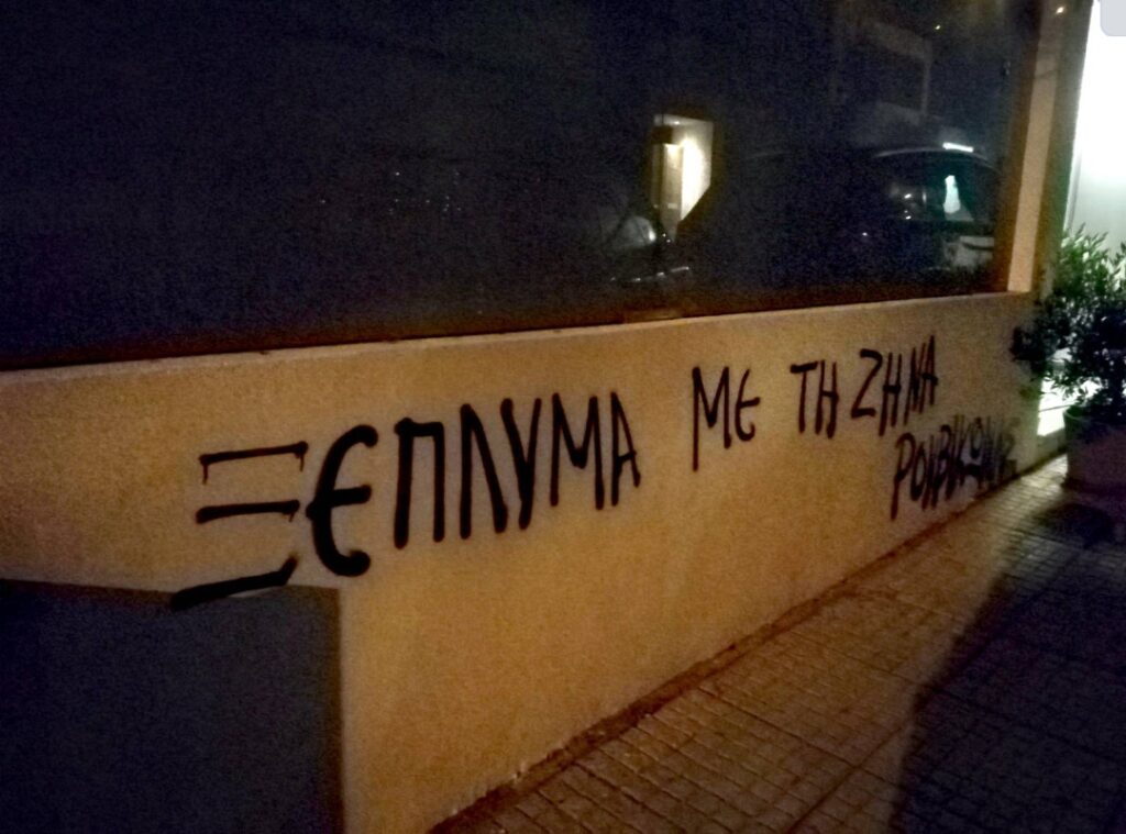 «Ξεπλυμα με τη Ζήνα» είναι το σύνθημα που έγραψε στη μάντρα του σπιτιού της Κουτσελίνη στην Εκάλη.
