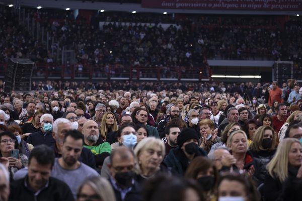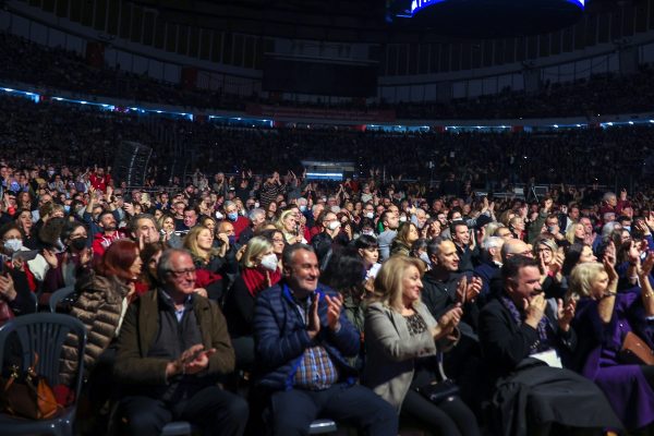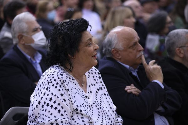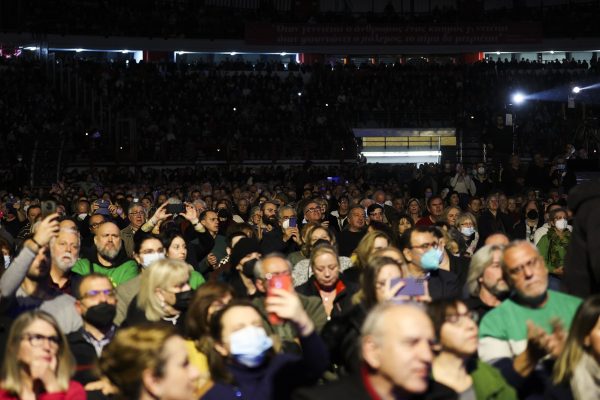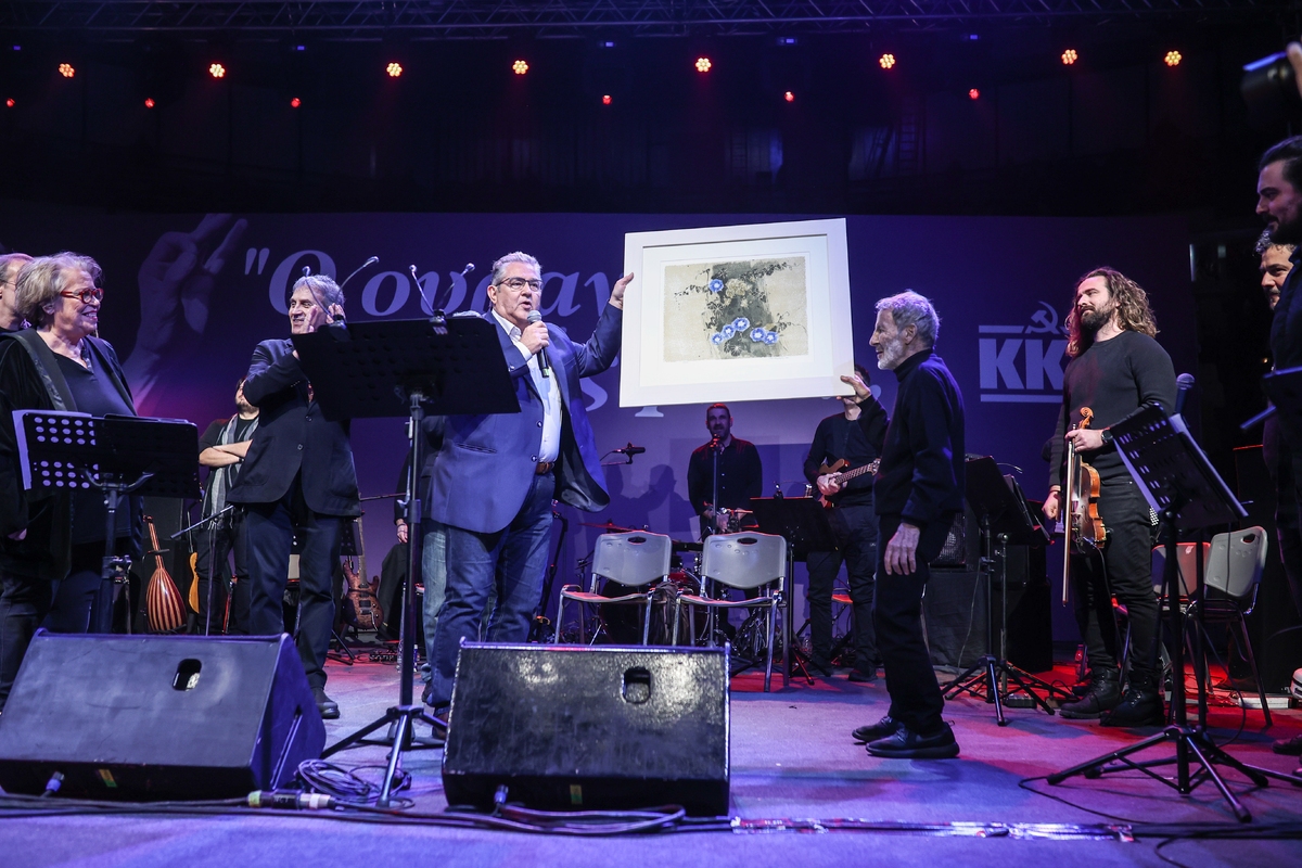Ο ΓΓ της ΚΕ του ΚΚΕ, Δημήτρης Κουτσούμπας ανέβηκε στη σκηνή μαζί με τον εμβληματικό δημιουργό Σταύρο Ξαρχάκο. Αντάλλαξαν θερμή χειραψία και χαιρέτισαν τον κόσμο που είχε συγκεντρωθεί στο ΣΕΦ για την εκδήλωση του ΚΚΕ.