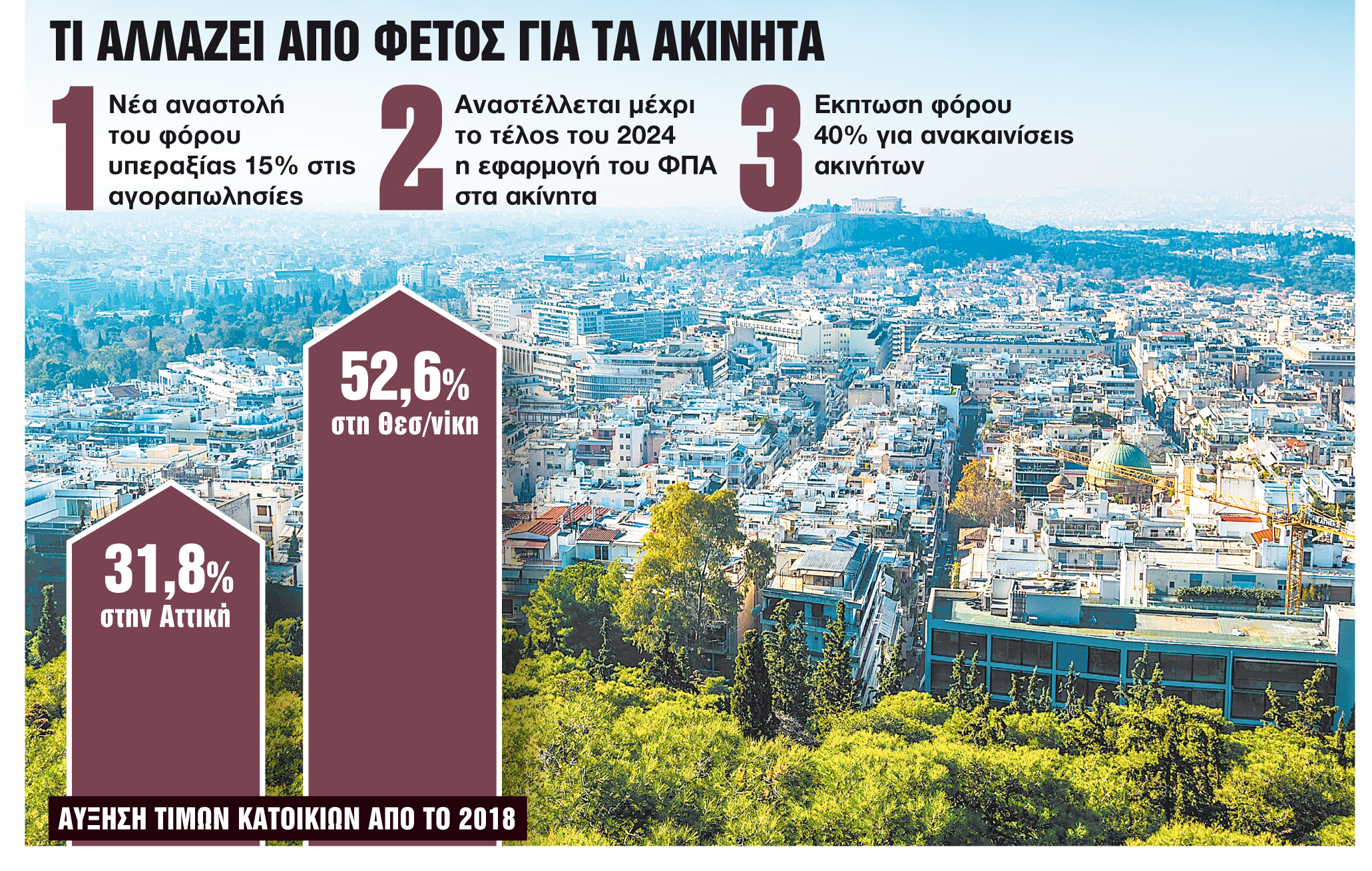 Νέα αναστολή του φόρου υπεραξίας 15% στις αγοραπωλησίες ακινήτων έως και το 2024. Επιβαρύνει τους πωλητές και προκύπτει από την πώληση ακινήτου σε τιμή ανώτερη της τιμής κτήσης.