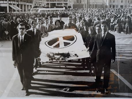 Στην κηδεία του κορυφαίου έλληνα βουλευτή και ακτιβιστή της Ειρήνης Γρηγόρη Λαμπράκη, μετείχε και το φοιτητικό τμήμα του κινήματος του φιλόσοφου ειρηνιστή Μπέρτραντ Ράσελ. Επικεφαλής αυτού του τμήματος ο τότε φοιτητής της Νομικής του ΕΚΠΑ Μιχάλης Περιστεράκης (πρώτος δεξιά στη φωτογραφία).