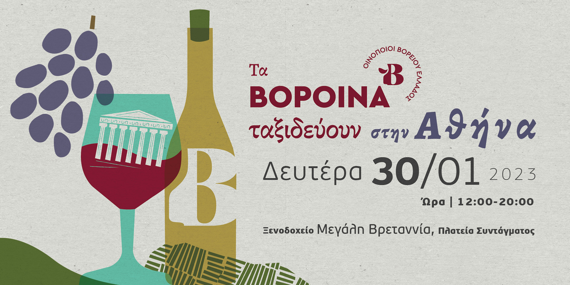 Από τις πλαγιές του Ολύμπου στις βουνοκορφές της Πίνδου και από εκεί στο πλατό του Αμυνταίου και σε όλη τη Μακεδονία, στους παραλίμνιους, παραθαλάσσιους και ορεινούς αμπελώνες της, τα θαυμαστά κρασιά και τα εξαίρετα αποστάγματα των “Οινοποιών Βορείου Ελλάδος”, στα ΒορΟινά της Αθήνας, τη Δευτέρα 30 Ιανουαρίου 2023!