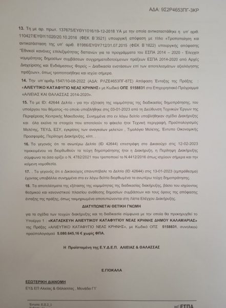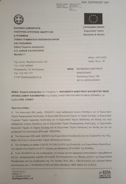 Την θετική γνωμοδότηση για τη δημοπράτησή του, η οποία δόθηκε από το Υπουργείο Αγροτικής Ανάπτυξης και Τροφίμων έλαβε ο Δήμος Καλαμαριάς και η δημοπράστηση του νέου αλιευτικοπύ καταφυγίου αναμένεται σύντομα..