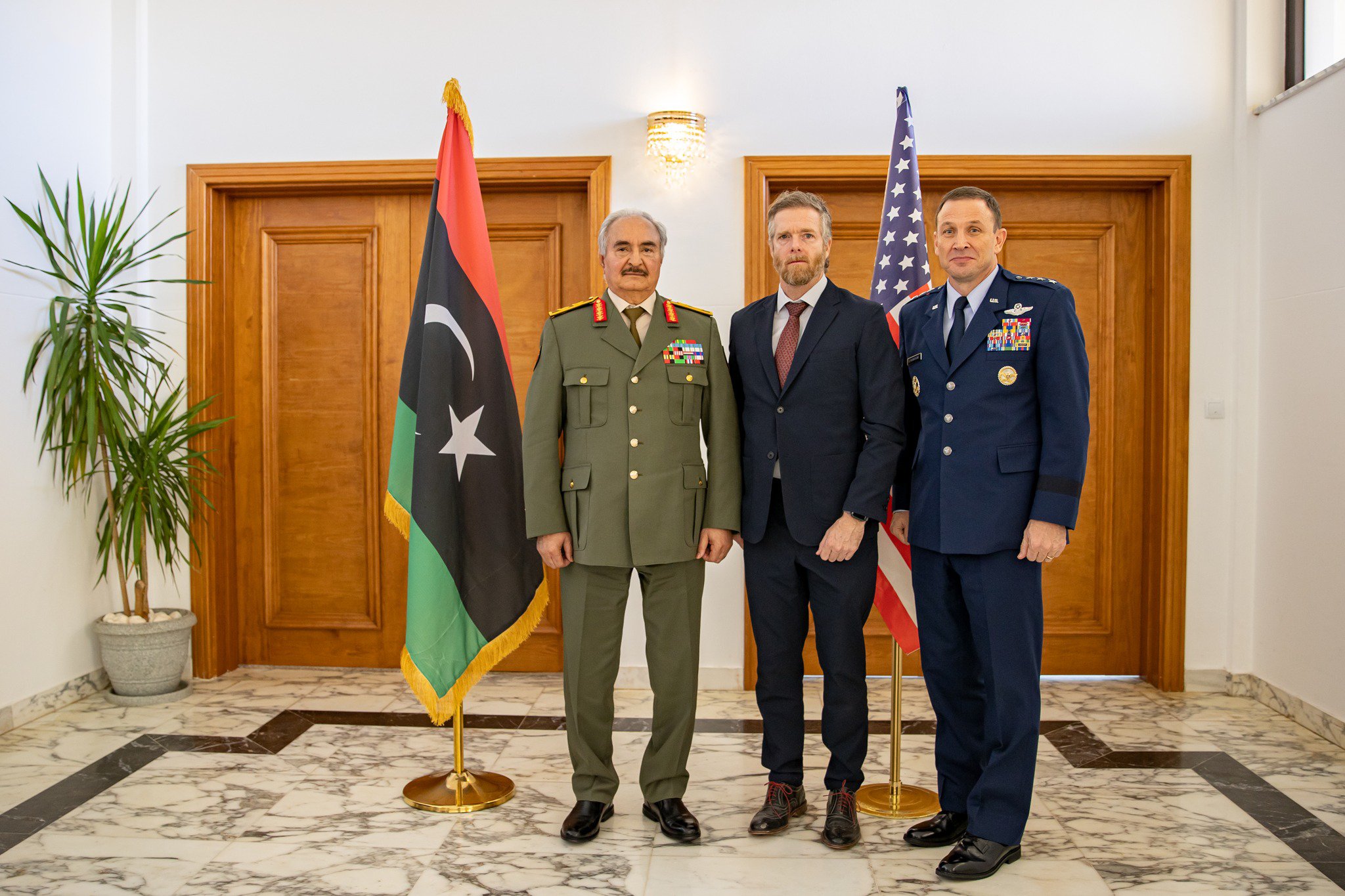 Ο στρατάρχης Χαλίφα Χαφτάρ συναντήθηκε χθες Τετάρτη στο γραφείο του, στην έδρα της Γενικής Διοίκησης στη Βεγγάζη, με τον επιτετραμμένο των ΗΠΑ στη Λιβύη Λέσλι Ορντμαν και τον αναπληρωτή διοικητή των αμερικανικών αεροπορικών δυνάμεων στην Ευρώπη και την Αφρική, αντιπτέραρχο Τζον Λαμοντάν (φωτογραφία, επάνω, από το Twitter).