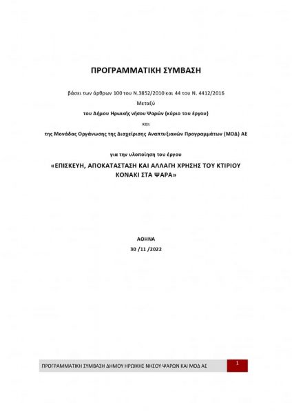 Μετά την υπογραφή της προγραμματικής σύμβασης του Δήμου με τη ΜΟΔ ΑΕ, το έργο «Επισκευή, αποκατάσταση και αλλαγή χρήσης του κτιρίου Κονάκι στα Ψαρά» μπαίνει σε τροχιά υλοποίησης.
