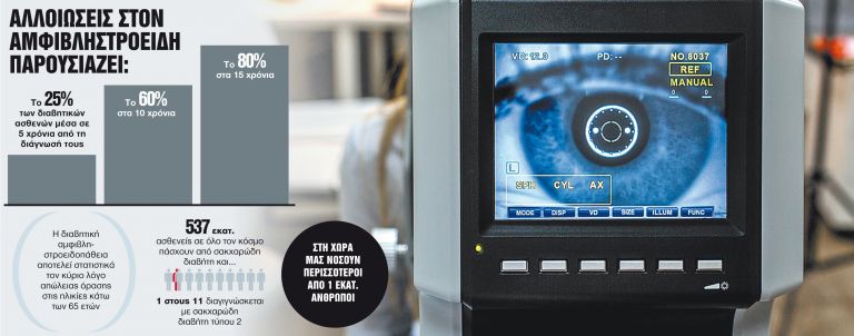 Επιπλέον, η διαβητική αμφιβληστροειδοπάθεια αποτελεί στατιστικά τον κύριο λόγο απώλειας όρασης στις ηλικίες κάτω των 65 ετών. «Ολοι οι πάσχοντες από σακχαρώδη διαβήτη, είτε είναι διαβήτης κύησης είτε τύπου 1 ή τύπου 2 διαβήτης, μπορεί να εκδηλώσουν αμφιβληστροειδοπάθεια» τονίζει ο δρ Αναστάσιος-Ι. Κανελλόπουλος, MD, χειρουργός-οφθαλμίατρος και καθηγητής Οφθαλμολογίας του Πανεπιστημίου της Νέας Υόρκης.