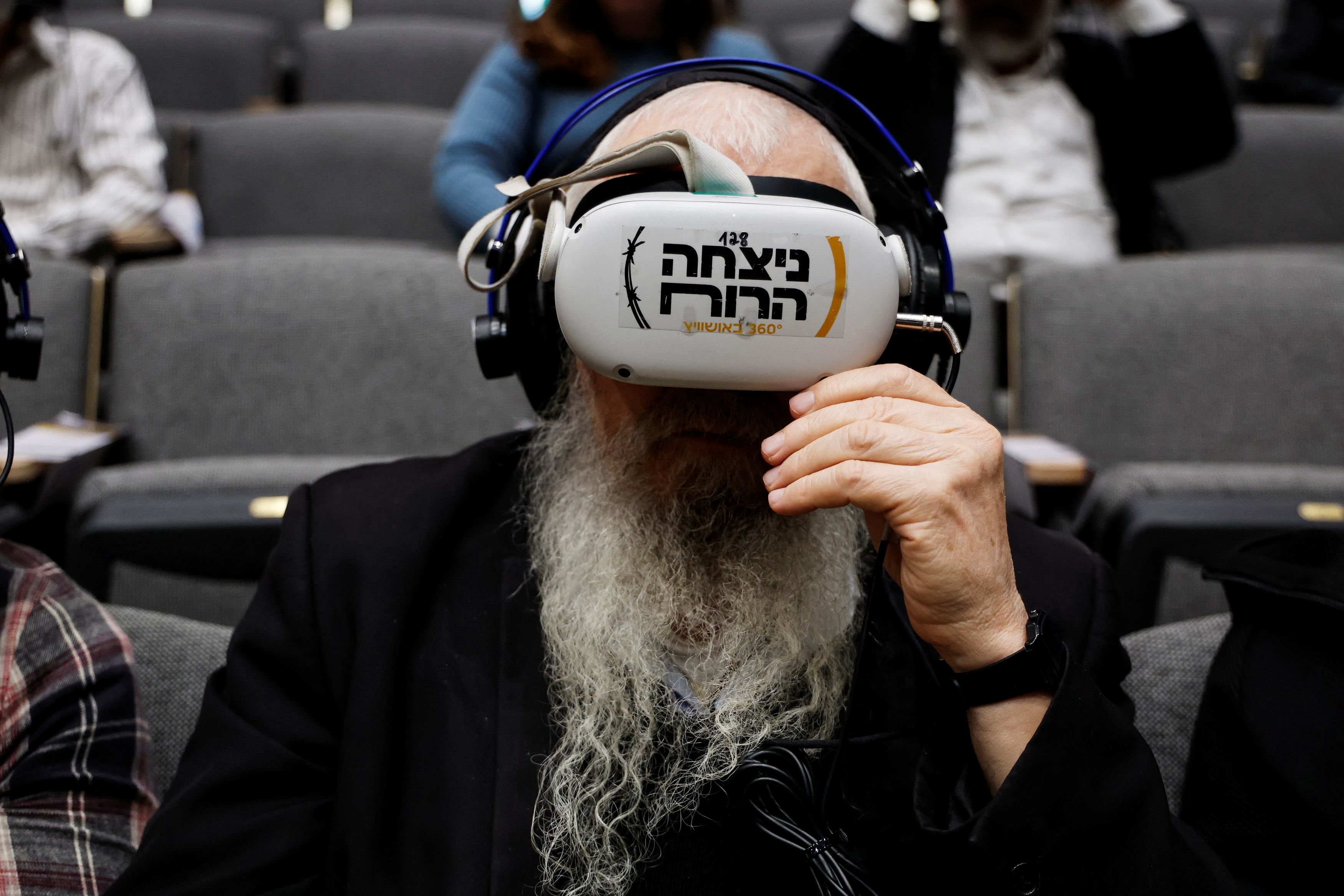 Groups participate in a virtual guided tour of Auschwitz-Birkenau and Polish Jewry before the Holocaust by using Virtual Reality headsets in Jerusalem