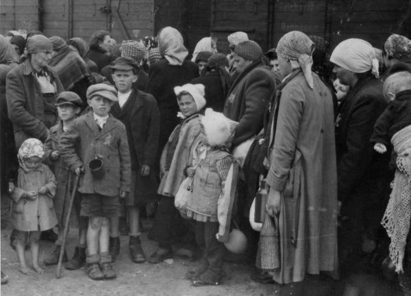 Άφιξη στο Άουσβτις Μπιρκενάου. Στο κέντρο βλέπουμε την Μπρύνα Σλόμοβιτς και τις δυο κόρες της. Λίγο μετά θα εξοντωθούν.