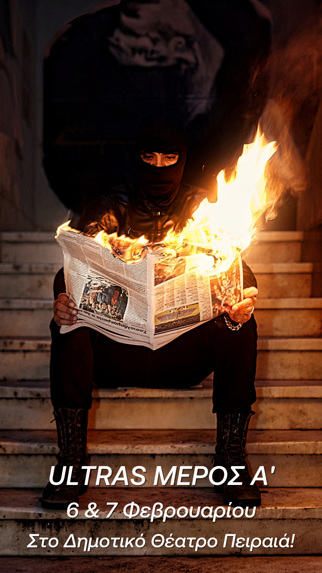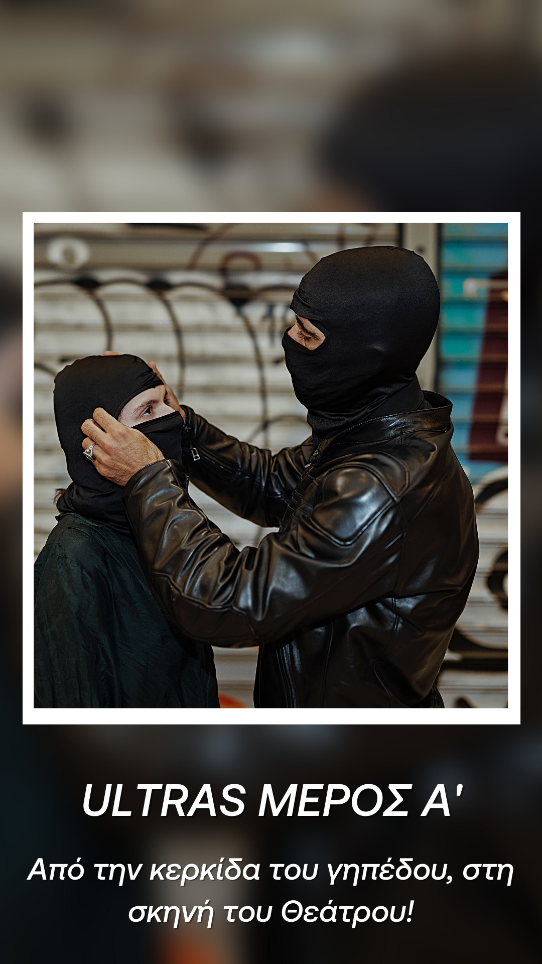 Η παράσταση με τίτλο Ultras -Μέρος Α’, The ReActing Body: Meisner + Physical Theatre Research Project, δεν είναι μια παράσταση που αφορά τη μπάλα. Είναι μία παράσταση για την εξέδρα. Για την καρδιά του γηπέδου που χτυπάει σαν μία. Μία καρδιά που συλλογικά μοιράζεται την αγωνία της έκβασης του αγώνα, την ανάγκη της νίκης. Μεγαλώνει γενιές, δημιουργεί ανθρώπινες σχέσεις και ιεραρχίες. Η καρδιά συνθέτει ένα είδος φυλής, μία οικογένεια που έχεις επιλέξει. Μέχρι τη στιγμή που η πρώτη αιματηρή σύγκρουση με τους αντιπάλους βάφει ολόμαυρο το πλάνο.