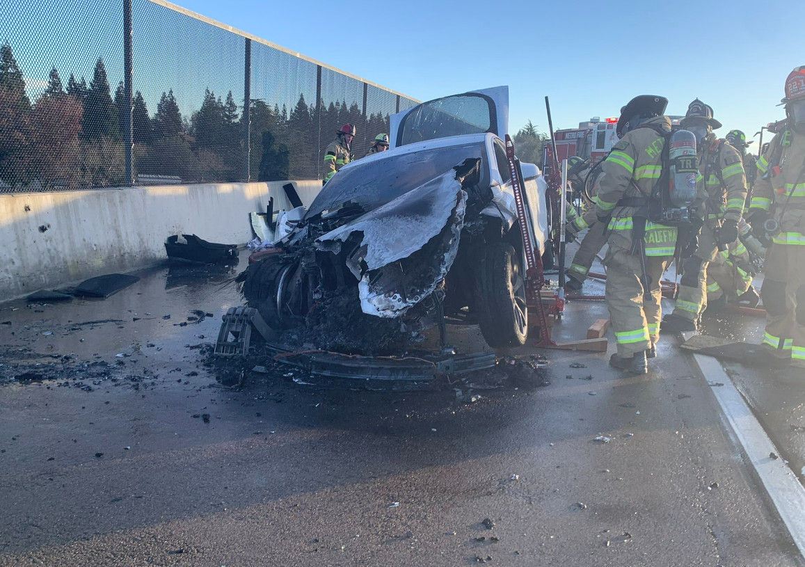 Οι Αρχές δεν ανέφεραν τραυματισμούς, παρά μόνο πως χρειάστηκαν 6.000 γαλόνια νερού προκειμένου να σβήσουν τη φωτιά, ενώ χρησιμοποιήθηκαν και γρύλοι για να ανυψώσουν το όχημα και να έχουν πρόσβαση στο κάτω μέρος για να κρυώσουν τη μπαταρία του.