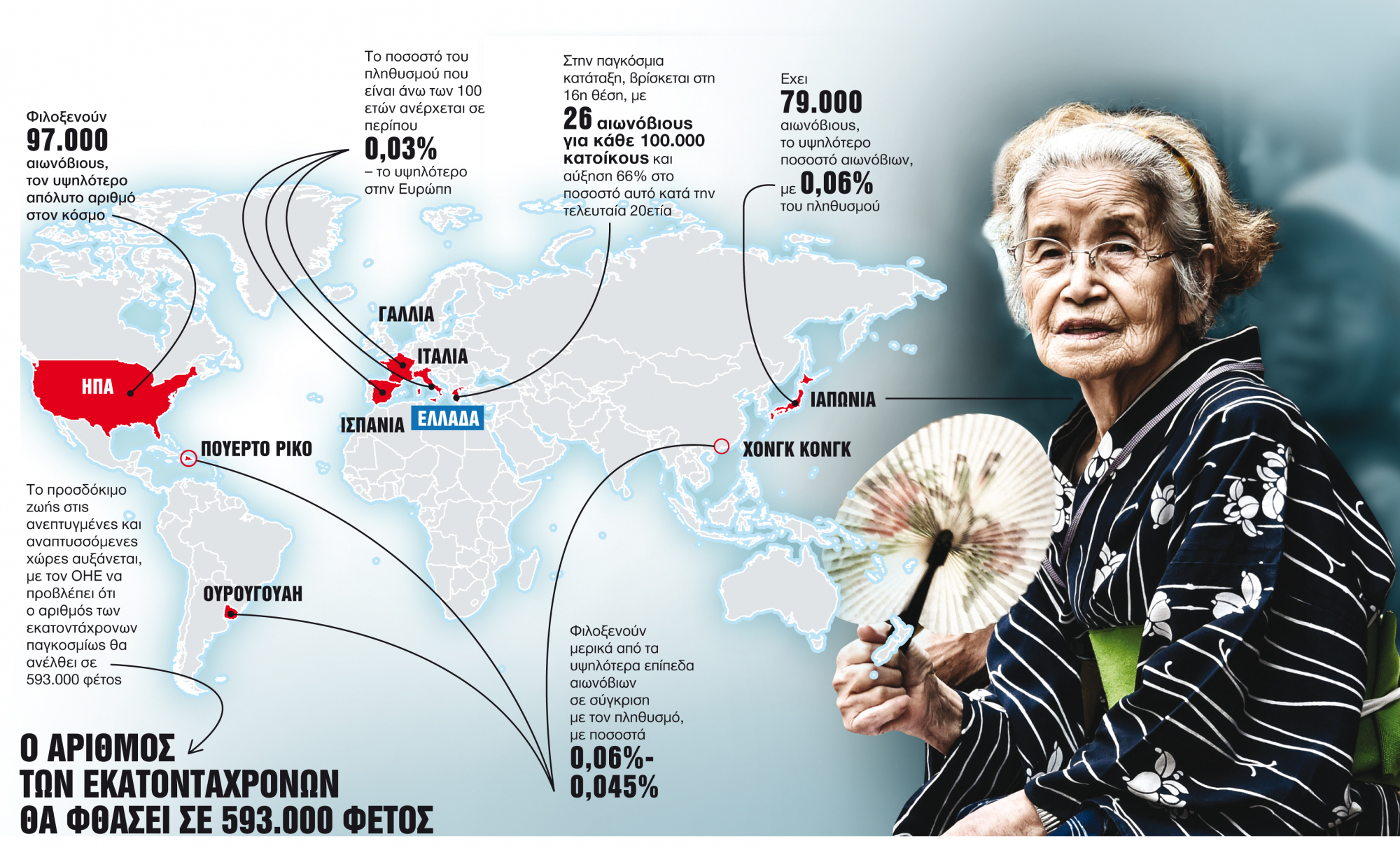 Με βάση μια εκτίμηση του 2022 από τα Ηνωμένα Εθνη, υπάρχουν 593.000 αιωνόβιοι σε όλο τον κόσμο – μια ταχέως αναπτυσσόμενη ηλικιακή ομάδα. Ο ΟΗΕ προβλέπει ότι μέχρι το 2050 θα υπάρχουν 3,7 εκατομμύρια εκατοντάχρονοι εν ζωή.