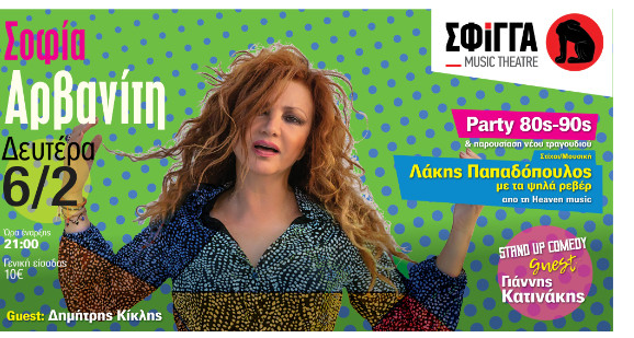 Η αγαπημένη σε όλους τους φίλους των 80’s & 90’s Σοφία Αρβανίτη, έρχεται στη μουσική σκηνή Σφίγγα, για ένα τρελό πάρτι όπου θα παρουσιάσει και ένα νέο τραγούδι σε ρυθμούς ροκ εντ ρολ του Λάκη Παπαδόπουλου που λέγεται «Σέ ζωντανές συναυλίες» και θα κυκλοφορήσει από τη Heaven music.
