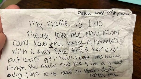 Εκεί αποκαλύφθηκε και η ιστορία της Lilo. «Η μαμά μου δεν μπορεί να με κρατήσει. Είναι άστεγη με δύο παιδιά. Έκανε ό,τι καλύτερο μπορούσε, αλλά δεν είχε βοήθεια. Ήταν πολλά τα έξοδα και δεν μπορούσε να με κρατήσει. Με αγαπά πραγματικά. Είμαι καταπληκτικός σκύλος και μου αρέσει να με αγαπούν. Σας παρακαλώ μη με κακοποιήσετε», συνέχιζε το χειρόγραφο σημείωμα.
