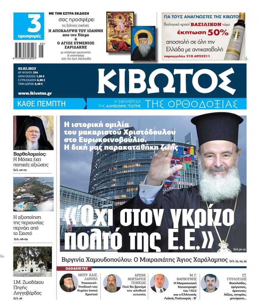 Όχι στον γκρίζο πολτό της Ε.Ε. Η ιστορική ομιλία του μακαριστού Χριστόδουλου στο Ευρωκοινοβούλιο. Η δική μας παρακαταθήκη ζωής Βαρθολομαίος : Η Μόσχα έχει παπικές αξιώσεις Η αξιοποίηση της περιουσίας περνάει από το Σχιστό Βιργινία Χαμουδοπούλου: Ο Μικρασιάτης Άγιος Χαράλαμπος (Α’) Προσκύνημα