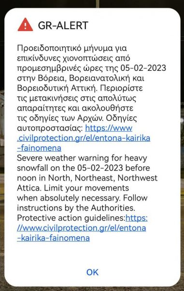 Νέο μήνυμα από την Υπηρεσία Eπικοινωνιών Εκτάκτου Ανάγκης 112 του υπουργείου Κλιματικής Κρίσης και Πολιτικής Προστασίας δέχθηκαν οι κάτοικοι του λεκανοπεδίου της Αττικής, ενόψει της κακοκαιρίας που θα φέρει χιονοπτώσεις και σημαντική πτώση της θερμοκρασίας.
