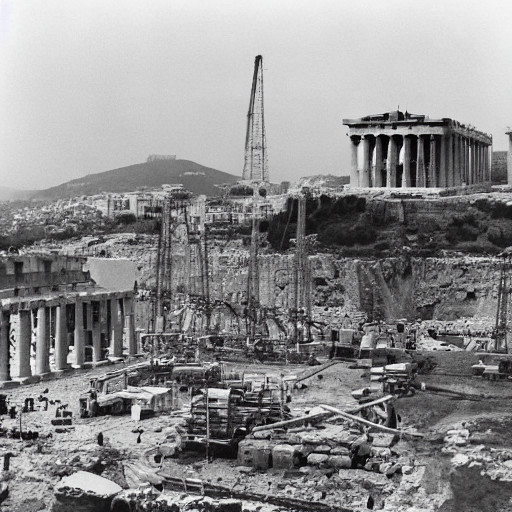 Ψεύτικη φωτογραφία της Ακρόπολης με γερανούς οικοδομών. Δημιουργήθηκε από τον συγγραφέα με τη βοήθεια τεχνητής νοημοσύνης Stable Diffusion