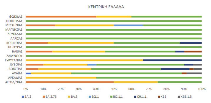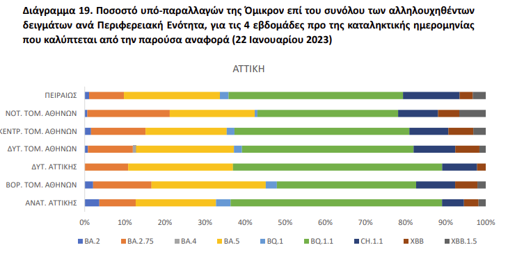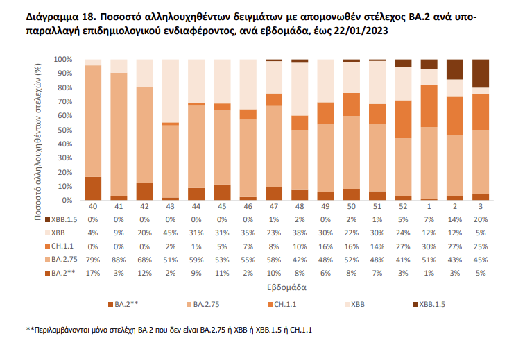 Μεταξύ των υποπαραλλαγών της BA.2, συχνότερη παραμένει η BA.2.75 (45%), ακολουθούμενη από την CH.1.1 «Όρθρος» (25% ) και XBB.1.5 «Kraken» (20%).