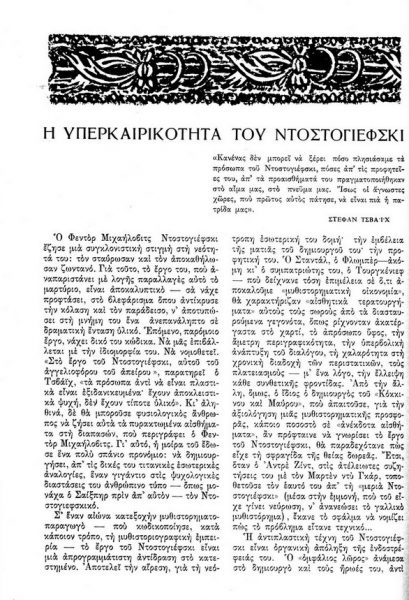 Οι ήρωες του Ντοστογιέφσκι αισθάνονται περισσότερο άνετα όταν κινούνται στο χώρο των ιδεών, παρά όταν βαδίζουν στους καθημερινούς δρόμους – σα να βαραίνουν τα βήματά τους τα τέσσερα κιλά αλυσίδες που είχαν φορέσει στα πόδια του δημιουργού τους καθώς ξεκινούσε κατάδικος για τη Σιβηρία. Θέλω να πω: ο ελάσσων Ντοστογιέφσκι είναι ο ρεαλιστής· ο μείζων, ο μυστικιστής. Πολύ επιγραμματικά το είχε επισημάνει ο Μερεζκόφσκι: «Στον Τολστόη ακούμε γιατί βλέπομε, στον Ντοστογιέφσκι βλέπομε γιατί ακούμε». Τα πράγματα του κόσμου, όπως διαθλώνται μέσα στην ψυχή του Ντοστογιεφσκικού ήρωα, του δίνουν εκείνη τη διάσταση προς το υπερκαιρικό, στην οποία οφείλει το δραματικό μεγαλείο του. Το βλέμμα του, ώρες-ώρες, μπορεί ν’ αντιφεγγίζει την απόγνωση ενός παγιδεμένου μέσα σ’ αυτό το δόκανο που αποκαλείται «Ζωή»· με την όλη του όμως στάση εκφράζει την υπερηφάνειά του ότι –και σ’ αυτή την παγίδα– μπορεί να σκέπτεται μ’ ελεύθερη συνείδηση. […]
