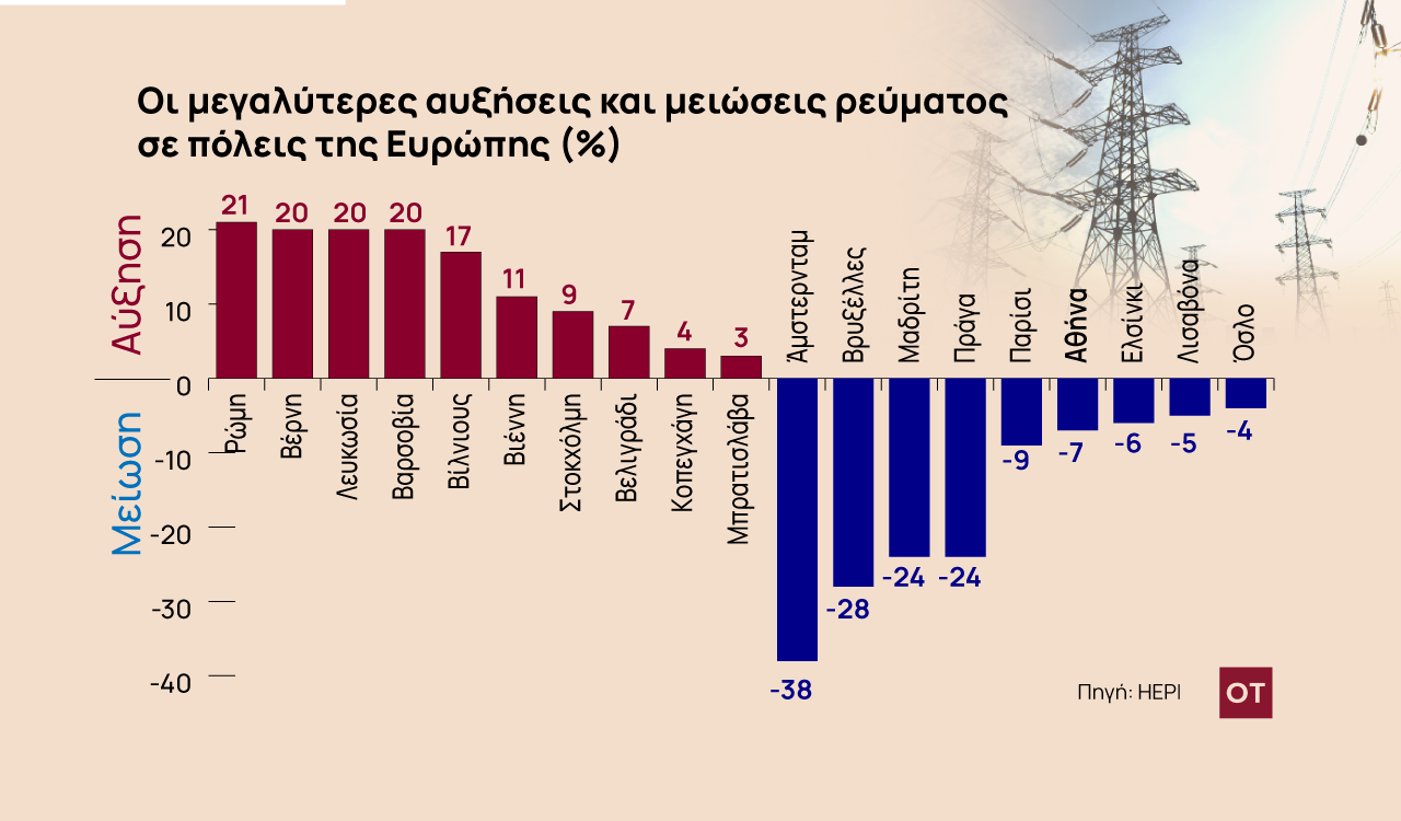 Ασανσέρ οι τιμές ρεύματος σε Ευρώπη και Ελλάδα με τον άνεμο και τα μέτρα στήριξης των κυβερνήσεων να καθορίζουν το ύψος των λογαριασμών.