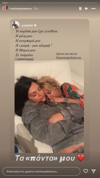 «Το κορίτσι μου έχει γενέθλια. Η φίλη μου. Η κουμπάρα μου. Η «μικρή» μου αδερφή. Η Μαρία μου. Σε λατρεύω. Χρόνια πολλά» έγραψε χαρακτηριστικά η Υβόννη Μπόσνιακ στη Μαρία Μπεκατώρου.