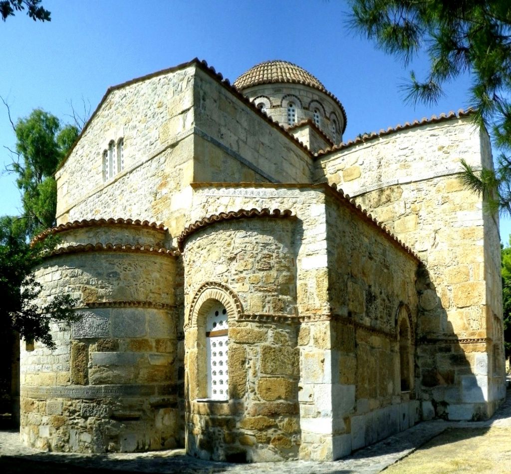 Όπως αναφέρει επιγραφή ενσωματωμένη στο εξωτερικό της αψίδας του ιερού, ο ναός, στην τοιχοδομία του οποίου έχει χρησιμοποιηθεί άφθονο υλικό (σπόνδυλοι κιόνων, πελεκημένα αγκωνάρια, επιτύμβιες στήλες) από το γειτονικό αρχαιολογικό χώρο, κατασκευάστηκε το 873-874 (χορηγός-κτήτοράς του ήταν ο βασιλικός πρωτοσπαθάριος Λέων).