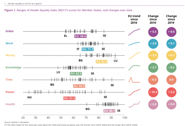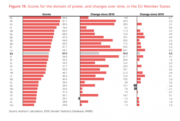 Η μεγαλύτερη πρόοδος για τις γυναίκες στη λήψη αποφάσεων συνολικά από το 2019 σημειώθηκε στο Λουξεμβούργο (+ 6,3 μονάδες), τη Λιθουανία (+ 6,1 μονάδες) και το Βέλγιο (+ 6,0 μονάδες). Τα κράτη μέλη που έχουν υποχωρήσει από τότε είναι η Εσθονία (- 2,6 μονάδες) και η Ρουμανία (- 2,1 μονάδες). Αξιοσημείωτη πρόοδος κατά τη διάρκεια της δεκαετίας σημειώθηκε επίσης σε Ιταλία (+ 31,7 μονάδες), Γαλλία (+ 29,3 μονάδες), Ισπανία (+ 28,0 μονάδες) και Γερμανία (+ 26,5 μονάδες)