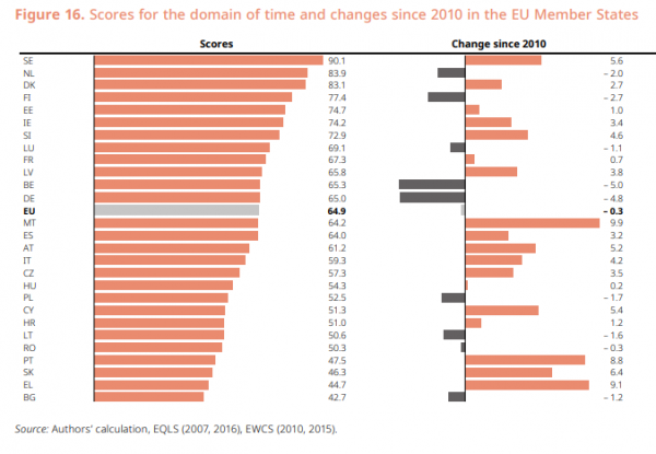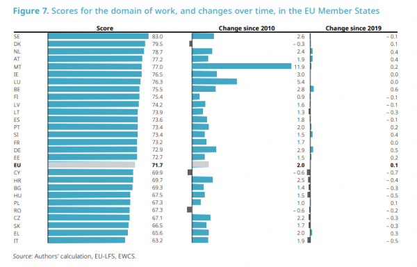 Η Ελλάδα βρίσκεται στην προτελευταία θέση (65.6), ενώ την τελευταία θέση κατέχει η Ιταλία (63.2). Πρώτη βρίσκεται η Σουηδία (83.0), ενώ ο μέσος όρος της ΕΕ είναι σχετικά χαμηλός στο 71.7.