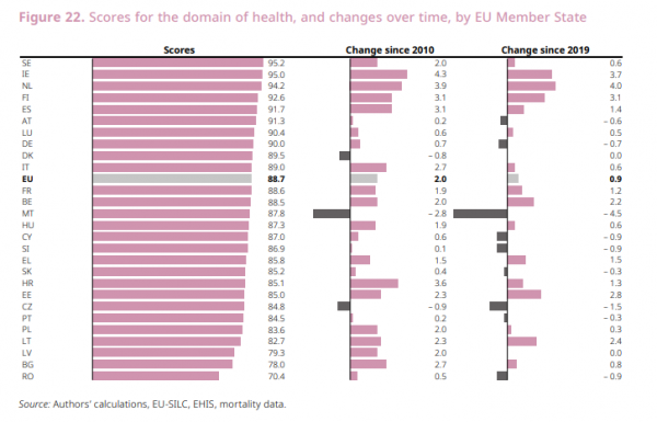 Καλύτερη επίδοσή έχει η χώρα μας στον τομέα της υγείας με 85.8, αφήνοντας πίσω χώρες όπως η Εσθονία, η Πορτογαλία, η Τσεχία, η Λετονία κα. Επίσης στον συγκεκριμένο τομέα έχει γίνει πρόοδος από το 2019 κατά 1.5%.