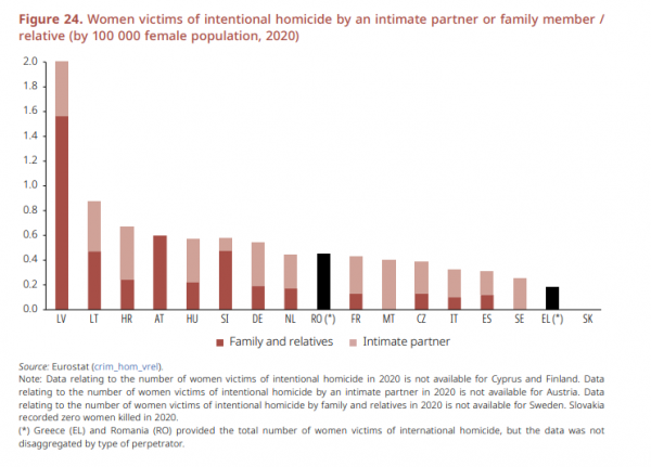 Όσον αφορά τις γυναικοκτονίες κατά το 2020, η χώρα μας βρίσκεται στην τελευταία θέση στον πίνακα (σσ. σημειώνοντας λιγότερες γυναικοκτονίες από τις υπόλοιπες χώρες) και είναι «βαμμένη» με μαύρο χρώμα, καθώς όπως αναφέρεται τα στοιχεία δεν ήταν διαχωρισμένα ανάλογα με το προφίλ του δράστη, αν δηλαδή ο δράστης ήταν συγγενικό πρόσωπο ή ο σύντροφος/σύζυγος. Σχετικά με την ψυχολογική βία που βιώνουν οι γυναίκες από τον σύντροφό/σύζυγό τους, η Ελλάδα είναι προτελευταία στον χάρτη με την Ισπανία και την Ιρλανδία να ακολουθούν.