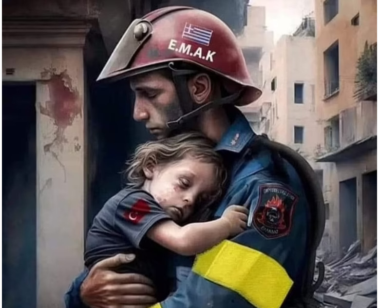 Σε αυτήν, δημιουργώντας μια ψηφιακά επεξεργασμένη εικόνα, ο υποστράτηγος ε.α. του Πυροσβεστικού Σώματος, Παναγιώτης Κοτρίδης, έστειλε την επομένη κιόλας των φονικών σεισμών το δικό του μήνυμα υποστήριξης και συμπαράστασης στους συναδέλφους του της ΕΜΑΚ, που μάχονταν στις επιχειρήσεις διάσωσης στις πληγείσες περιοχές της Τουρκίας, «ανεβάζοντας» την φωτογραφία στα social media, η οποία πολύ σύντομα έγινε viral.