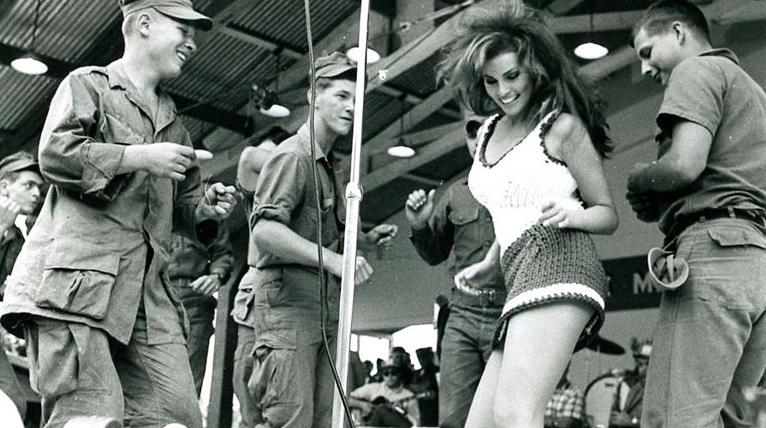 1967. Vietnam. 65,000 troops on hand, Raquel Welch joins Bob Hope on stage for his annual Christmas show. For 20 minutes, she invited as many troops to the stage for a dance as could make it. Among the most famous of Hope’s famous moments. RIP, Raquel, & thanks for the memories… pic.twitter.com/aTBSRjZpOt