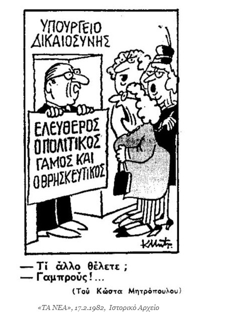 Στις 17 Φεβρουαρίου του 1982 ο πολιτικός γάμος καθιερώνεται και στη χώρα μας μετά από θεσμοθέτηση από την Κυβέρνηση του Ανδρέα Παπανδρέου που είχε ονομαστεί ως «Κυβέρνηση Αλλαγής». Μέχρι και εκείνη τη χρονική περίοδο ίσχυε ο θρησκευτικός γάμος (η υποχρεωτική ιερολογία του γάμου) ο οποίος είχε καθιερωθεί με Νεαρά του αυτοκράτορα Λέοντος ΣΤ’ του Σοφού το 893 μ.Χ. («Μη ερρώσθαι τα συνοικέσια άνευ της ιεράς ευλογίας»).