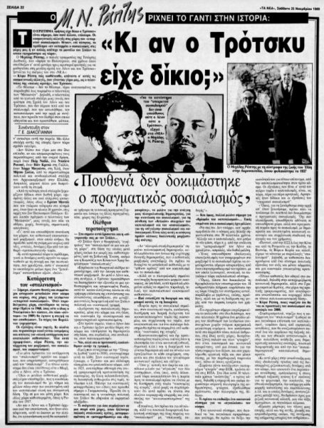 Το Νοέμβριο του 1989, κι ενόσω πραγματοποιούνταν κοσμογονικές αλλαγές στις χώρες του Ανατολικού Μπλοκ (πτώση του Τείχους του Βερολίνου κ.λπ.), ο Μιχάλης Ράπτης παραχώρησε μια πολύ ενδιαφέρουσα συνέντευξη στο δημοσιογράφο και συγγραφέα Γ. Ε. Διακογιάννη (1957-2006), που δημοσιεύτηκε στην εφημερίδα «Τα Νέα» το Σάββατο 25 Νοεμβρίου 1989.
