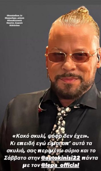 «Κακό σκυλί, ψόφο δεν έχει. Και επειδή εγώ είμαι από αυτά τα σκυλιά, σας περιμένω αύριο και το Σάββατο στην Autokinissi22 πάντα με τον Λευτέρη Πανταζή», έγραψε ο ίδιος στα Instagram Stories του.