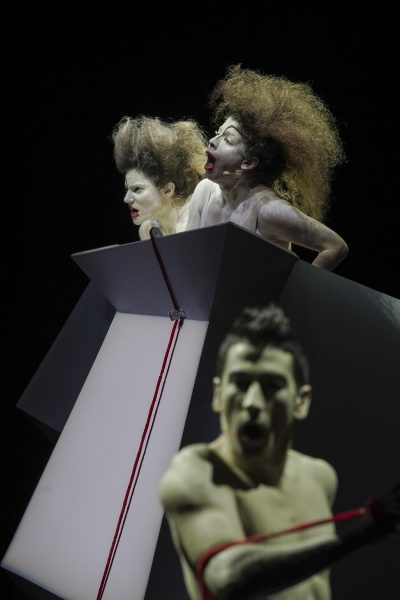 Πρόκειται για δύο εξαιρετικές συνεργάτιδες που έχουν διανύσει χιλιόμετρα σκηνικής παρουσίας στις παραστάσεις της Ομάδας Σημείο Μηδέν, αντιμετωπίζοντας ερμηνευτικές προκλήσεις που συχνά ξεπερνούν το ανθρωπίνως δυνατόν. Τον ρόλο της φιγούρας κρατάει ο Μπάμπης Αλεφάντης, ένας επίσης εξαιρετικός ηθοποιός με τον οποίο συνεργαζόμαστε τα τελευταία χρόνια. Οι δύο γυναίκες ανήκουν στο ίδιο σώμα. Aναδύονται από έναν κρατήρα, δημιουργώντας τη συνθήκη ενός παράξενου, σύγχρονου και τραυματισμένου Προμηθέα. Η ιδέα της σκηνικής εγκατάστασης αναπτύχθηκε από τη συνεργάτιδά μου, σκηνογράφο και ενδυματολόγο Κατερίνα Παπαγεωργίου. Ο φωτισμός του κόσμου της μπεκετικής έκρηξης της μνήμης του τραύματος υλοποιήθηκε από τον σταθερό μου συνεργάτη, ήδη από την ίδρυση της Σημείο Μηδέν το 2008, Κώστα Μπεθάνη».