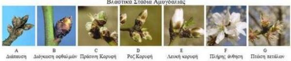 Η αμυγδαλιά αυτή την περίοδο βρίσκεται στο βλαστικό στάδιο Β (διόγκωση οφθαλμών) έως D (ροζ κορυφή) ανάλογα με την περιοχή.