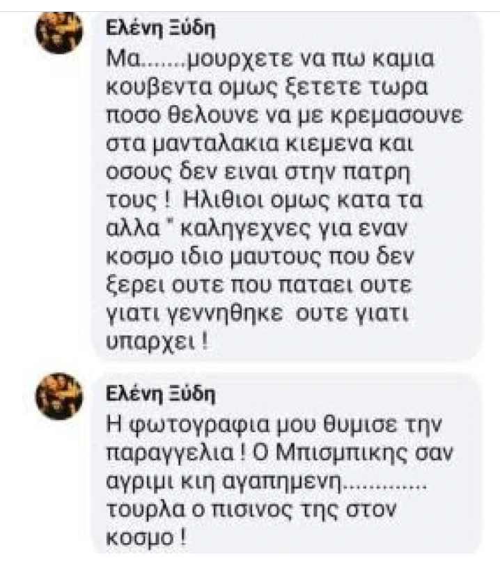 Στη συνέχεια, η Ελένη Βιτάλη επανήλθε με νέο σχόλιο: «Η φωτογραφία μου θύμισε την παραγγελιά! Ο Μπισμπίκης σαν αγρίμι κι η αγαπημένη… τούρλα ο πισινός της στον κόσμο!».