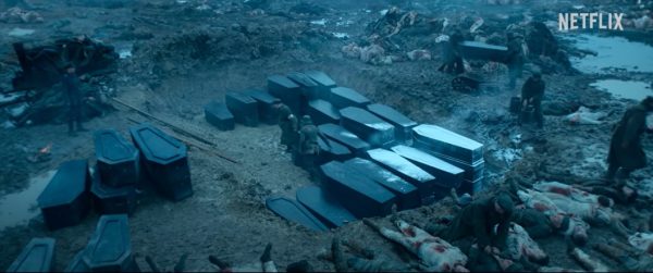 Το έδαφος ήταν παγωμένο τον Ιανουάριο του 2021, όταν ο σχεδιαστής παραγωγής Κρίστιαν Γκόλντμπεκ έδωσε το πράσινο φως στους εκσκαφείς να αρχίσουν να ανοίγουν εκατοντάδες μέτρα τάφρων σε μια έκταση μεγέθους τεσσάρων γηπέδων ποδοσφαίρου. «Προσπαθήσαμε να δώσουμε στο κοινό την κλίμακα του όλου πράγματος, και αυτό ήταν αρκετά δύσκολο έργο».