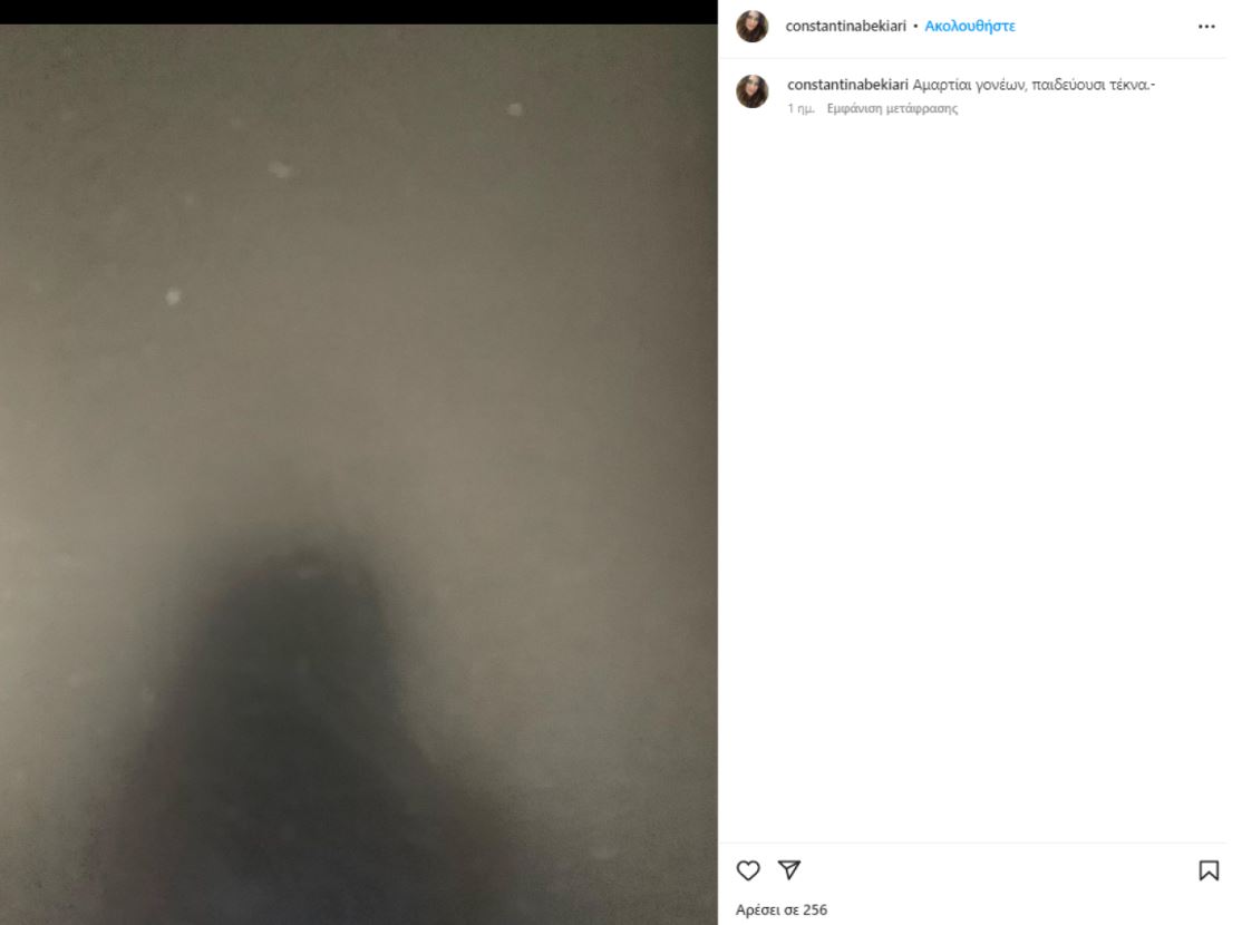 Συγκεκριμένα, η Κωνσταντίνα Μπεκιάρη έγραψε στο Instagram «Αμαρτίαι γονέων, παιδεύουσι τέκνα», χωρίς πάντως να διευκρινίζει αν αναφέρεται στο ζευγάρι.