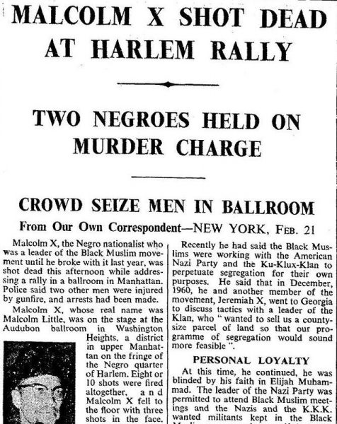 Ο ηγέτης των αγώνων για πολιτικά δικαιώματα, Μάλκολμ Χ, ανέβηκε στη σκηνή του Audubon Ballroom στη γειτονιά Washington Heights, στο Μανχάταν, στις 21 Φεβρουαρίου 1965. Λίγα λεπτά αργότερα, αμέσως μετά τις 3 μ.μ., πυροβολήθηκε από τρεις άνδρες, ενώ η σύζυγός του, Μπέτι Σαμπάζ, έγκυος σε δίδυμα, και οι τέσσερις κόρες του βρίσκονταν στην πρώτη σειρά. Ήταν 39 ετών.