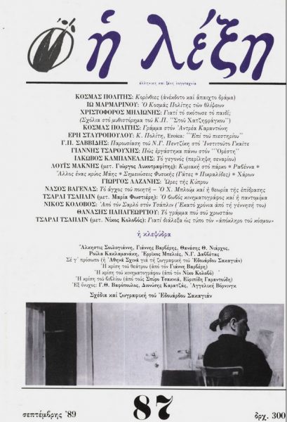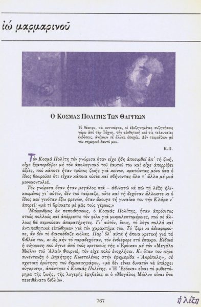 *Κείμενο της Ιώς Μαρμαρινού, που έφερε τον τίτλο «Ο Κοσμάς Πολίτης των θλίψεων» και είχε συμπεριληφθεί στο τεύχος 87 του περιοδικού «Η Λέξη» (Σεπτέμβριος 1989).