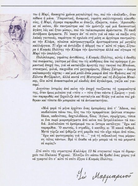 Ο θάνατος της Κλάρας, όπως και ο θάνατος της Κνούλης (σ.σ. της κόρης του) στην Κατοχή, στάθηκε καταλυτικός για τον Κοσμά Πολίτη. Όσο ζούσε, η Κλάρα «υπήρχε» παντού. Ψηλή, λεπτή, αθόρυβη, με το μακρύ μαύρο φόρεμά της, τις κομψές αργές, αλλά με νεύρο κινήσεις, το προφίλ της που θύμιζε παλιό καμέο, τα γερμανικά περιοδικά με σταυρόλεξα και ζώδια, οι Γερμανοί κλασικοί, παλιές εκδόσεις Λειψίας σε γοτθική γραφή, το κατάλευκο μαντηλάκι που έβγαζε από το μακρύ μανίκι της και το ’φερνε στο πρόσωπό της, το άρωμα από βιολέττες της Πάρμας, η σαμπάνια Βεβ Κλικό ροζέ, η υπηρεσία με το άσπρο μποννέ και την ποδίτσα, η νοσταλγία για το πατρικό σπίτι και τους φίλους των νεανικών χρόνων: τις κόρες του Κάιζερ που κάνανε μαζί ιππασία και τον Γκούσταβ Μάλερ που την αλληλογραφία της μαζί του φύλαγε σ’ ένα κουτί καταχωνιασμένο στην κάμαρά της, τα κομψά ρεστωράν, τα κολλαριστά χιονάτα τραπεζομάντηλα, η Καθολική εκκλησία που πήγαινε και κοινωνούσε, τα ζώα που τ’ αγαπούσε και τα φρόντιζε, οι λιχουδιές που έφτιαχνε μόνη της, η Σμύρνη και το παράσημο που της έδωσε ο Σουλτάνος, το αυτοκίνητό της το Ιροντέλ, από τα πρώτα αυτοκίνητα στην Αθήνα, ο αβάσταχτος πόνος για το χαμό της Κνούλης, μα πάνω απ’ όλα η φροντίδα και η αφοσίωσή της σε «εκείνον», όπως τον έλεγε, όλα αυτά συνέθεταν την Κλάρα, που ανήκε σε μια άλλη εποχή και είχε βάλει ανεξίτηλη τη σφραγίδα της πάνω στον Κοσμά Πολίτη.