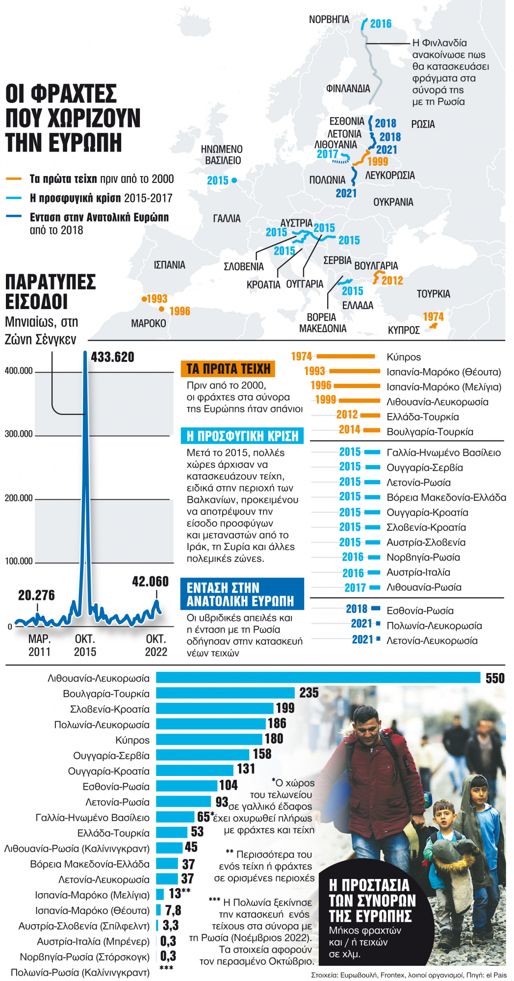 Απέναντι σε αυτή την εικόνα και με δεδομένη την αποτυχία των «27» να καταλήξουν σε κοινή πολιτική, η επιλογή την οποία έχουν κάνει αρκετοί εταίροι μοιάζει, συνειδητά ή ασυνείδητα, να οδηγεί τη Γηραιά Ηπειρο τρεις και πλέον δεκαετίες πίσω: Σχεδόν 34 χρόνια μετά την πτώση του Τείχους του Βερολίνου και την τελευταία οκταετία, έχουν κατασκευαστεί τείχη μήκους περίπου 1.700 χιλιομέτρων στα εξωτερικά σύνορα της ΕΕ. Κι αυτό, όπως αναφέρει η «El Pais», «όχι για να προστατευτούν από τανκς και στρατιώτες, αλλά από μετανάστες και πρόσφυγες».
