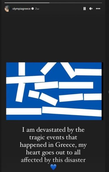 Η Μαρία Ολυμπία κατέβασε την επίμαχη ανάρτηση σήμερα Πέμπτη 2/3. Στη συνέχεια ανέβασε ένα post στα Instagram Stories της για να εκφράσει τη λύπη της για την τραγωδία στα Τέμπη.