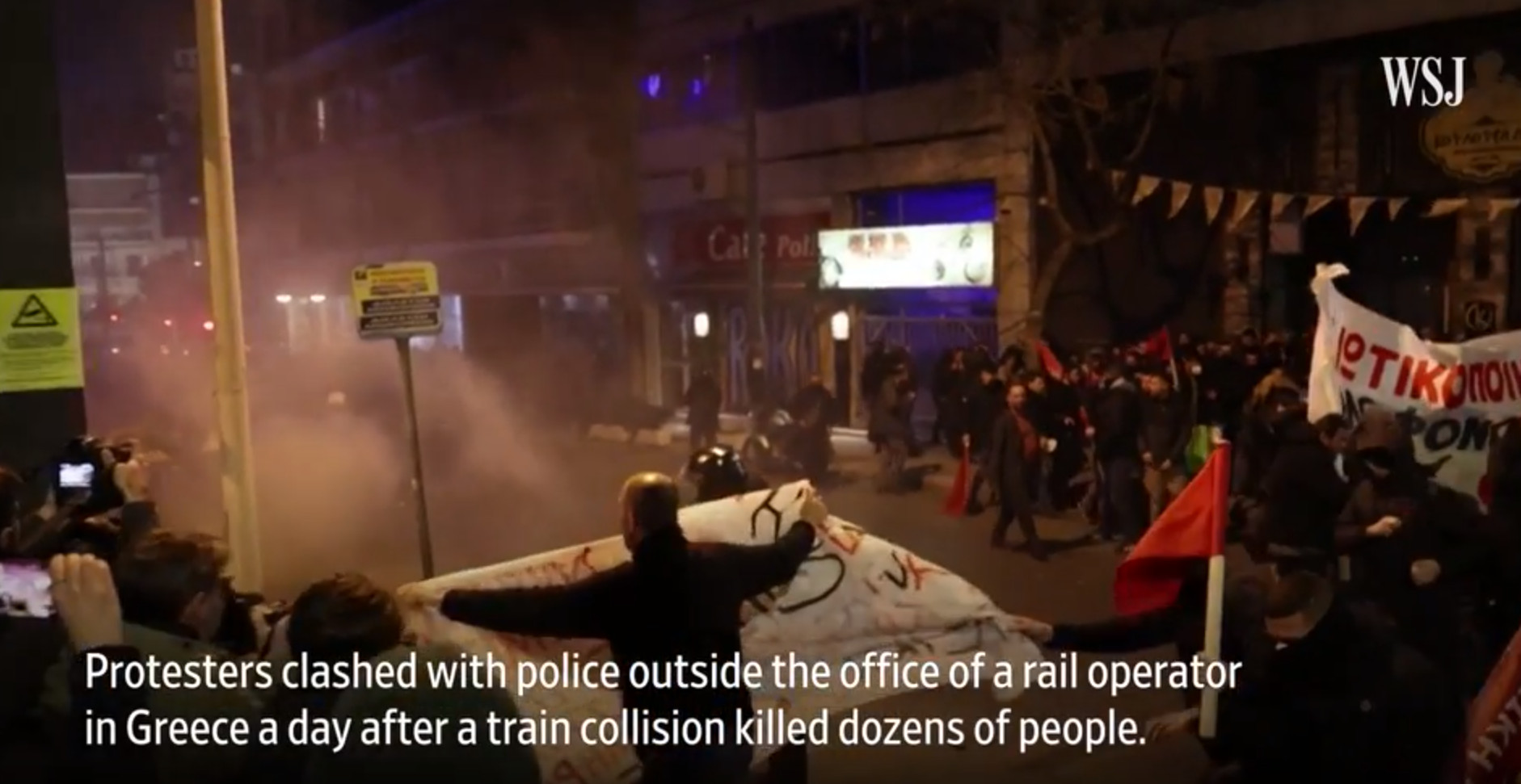 Όπως αναφέρει στο ρεπορτάζ της «οι οδομαχίες μεταξύ διαδηλωτών και αστυνομίας ξέσπασαν έξω από τα γραφεία ενός σιδηροδρομικού φορέα στην Ελλάδα την Τετάρτη, μια ημέρα μετά το ατύχημα τρένου που σκότωσε δεκάδες ανθρώπους. Ο πρωθυπουργός της χώρας είπε ότι όλα δείχνουν «ένα τραγικό ανθρώπινο λάθος» και δεσμεύτηκε να το διερευνήσει.