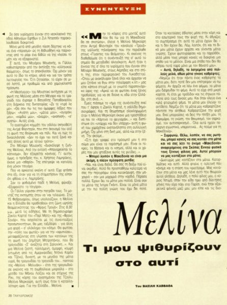 Στο τεύχος του «Ταχυδρόμου» που είχε κυκλοφορήσει στις 20 Ιανουαρίου 1993 είχε φιλοξενηθεί μια συνέντευξη που είχε παραχωρήσει η Μελίνα Μερκούρη (έφυγε από τη ζωή ακριβώς πριν από 29 χρόνια, στις 6 Μαρτίου 1994) στον Βασίλη Καββαθά. Αφορμή για τη συνομιλία αυτήν είχε σταθεί το γεγονός ότι η Μελίνα –το τηλεοπτικό πορτρέτο της– είχε περιληφθεί στους «Γίγαντες του θεάματος», μια σειρά του τρίτου καναλιού («Φρανς Τρουά») της γαλλικής τηλεόρασης. Τα γυρίσματα, όπως διαβάζουμε στο σχετικό εισαγωγικό κείμενο, είχαν γίνει εκείνον τον καιρό στο Μέγαρο Μουσικής, στους Αέρηδες και στο σπίτι της Μελίνας, στον περιφερειακό του Λυκαβηττού.