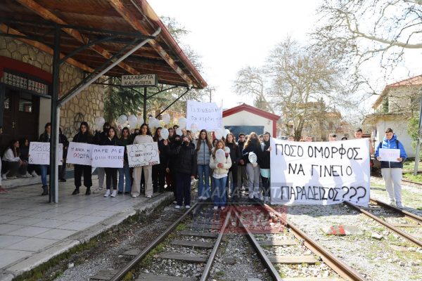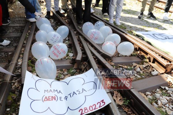 Μαθητές στα Καλάβρυτα άφησαν μπαλόνια στις ράγες και απήγγειλαν ποιήματα» για τα θύματα στην τραγωδία στα Τέμπη.