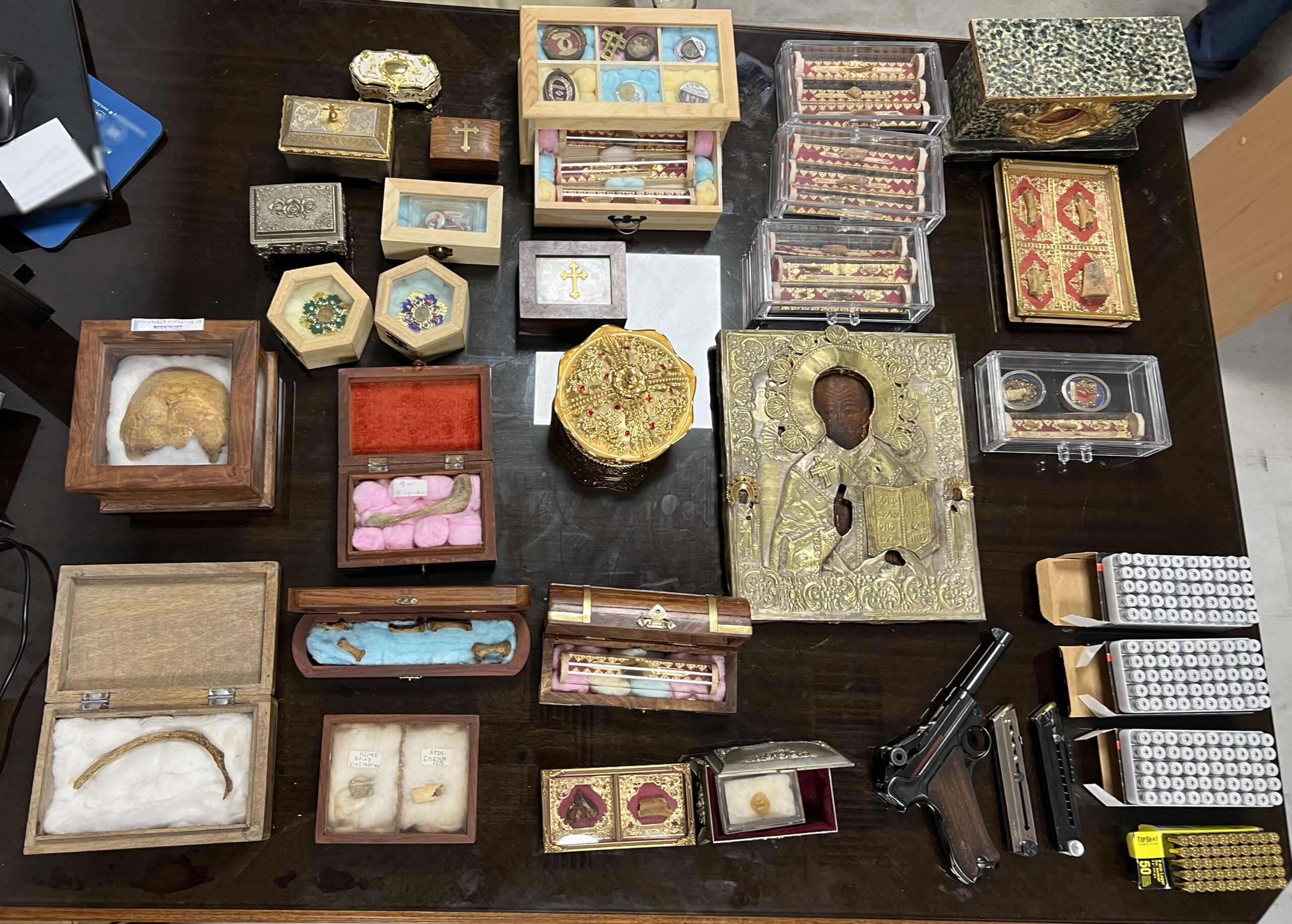 Σύμφωνα με ανακοίνωση της Γενικής Αστυνομικής Διεύθυνσης Κρήτης, «στο πλαίσιο δράσεων για την καταπολέμηση της παράνομης εμπορίας αρχαιοτήτων και την εν γένει προστασία της πολιτιστικής κληρονομιάς που εκπονεί η Γενική Περιφερειακή Αστυνομική Διεύθυνση Κρήτης και κατόπιν κατάλληλης αξιοποίησης πληροφοριών, συνελήφθη στο πλαίσιο αστυνομικής επιχείρησης ο ημεδαπός, ο οποίος διέθετε έναντι αμοιβής προθήκες περιέχουσες -κατά τα λεγόμενά του- τμήματα οστών αποδιδόμενα σε Αγίους της Ορθόδοξης και Ρωμαιοκαθολικής Εκκλησίας, εικόνες και ιερατικά αντικείμενα».